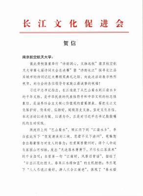 近日,由长江文化促进会指导、南京航空航天大学(简称“南航”)主办的“诗韵长江”探寻长江沿岸城市的诗词记忆大赛暨 “诗韵润心·文脉远航”第七届诗词大会总决赛颁奖典礼在南航将军路校区成功举行,长促会为活动致贺信。