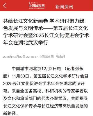 中国城市网:共绘长江文化新画卷 学术研讨聚力绿色发展与文明传承——第五届长江文化学术研讨会暨2025长江文化促进会学术年会在湖北武汉举行