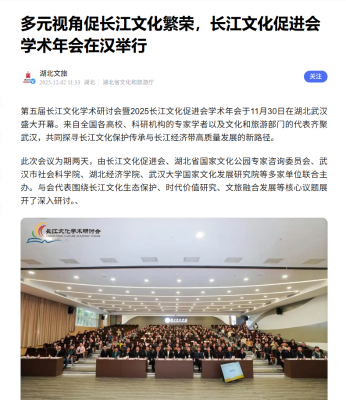 2025年11月30日至12月1日,第五届长江文化学术研讨会暨2025长江文化促进会学术年会在湖北武汉举行。会议主题是:习近平总书记“共抓大保护,不搞大开发”重要讲话发表十周年,以长江文化助推长江绿色发展。来自全国高校、科研机构、重点企业的300多位专家学者以及文化和旅游部门代表齐聚武汉,共同探讨长江文化保护传承与长江经济带高质量发展新路径。本次会议由长江文化促进会、湖北省国家文化公园专家咨询委员会、湖北经济学院、武汉市社会科学院、武汉市社会科学界联合会、武汉大学国家文化发展研究院等多家单位联合主办。与会代表围绕长江文明溯源与传播展示、长江文化时代价值的弘扬、文化赋能长江经济带高质量发展、长江国际黄金旅游带高质量发展等关键议题展开深入交流。研讨会设开幕式、主旨报告、平行论坛等环节。新华网、央广网、中国社会科学报、中国城市网、国际在线、湖北日报、湖北文旅、长江网、九派新闻、汉新闻、上游智库、武汉广播电视台等媒体进行现场报道,据不完全统计,本次研讨会相关报道获1600多万网友关注。