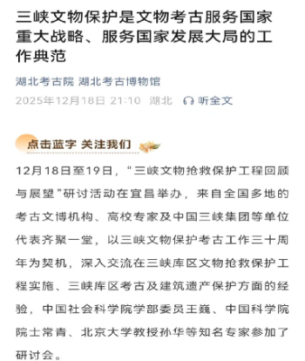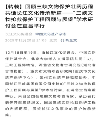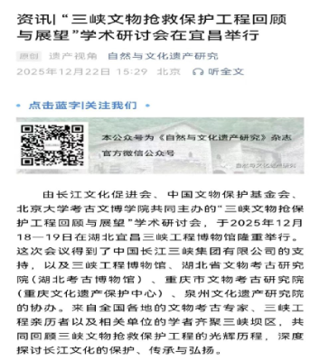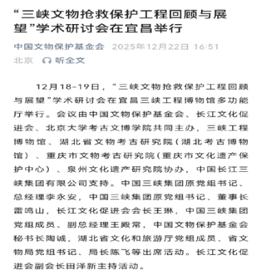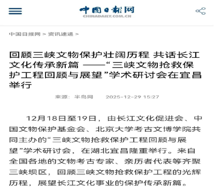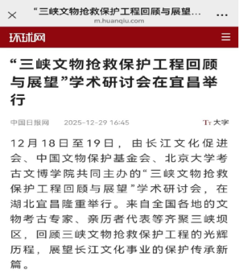 2025年12月18日至19日,“三峡文物抢救保护工程回顾与展望”学术研讨会在湖北宜昌举行。本次会议由长江文化促进会联合中国文物保护基金会、北京大学考古文博学院共同主办,三峡工程博物馆等单位协办。来自全国各地的文物考古专家、亲历者代表等齐聚三峡坝区,共同回顾三峡文物抢救保护工程的光辉历程,深度探讨长江文化的保护、传承与弘扬。与会专家普遍认为,三峡工程的库区考古是“国内乃至世界上配合大型基本建设工程实施的历史时间最长、工作区域范围最广、参加队伍最多、发掘遗址数量最多、出土文物数量最多、出土遗存跨度最大的超大型考古文保项目”,为“文物保护工作提供了可借鉴的标准与经验”,从考古学角度总结和丰富了三峡工程的文化内涵和独特价值。本次研讨会分为实地考察与学术研讨两大环节。在学术研讨环节,通过主题分享、主旨报告、圆桌会议研讨等形式,围绕“三峡文物保护工程的回顾与展望”主题开展深入交流,进行充分讨论,提出和形成了一些新的总结性经验与结论。国家文物局、中国文物报、自然与文化遗产研究、中国日报网等媒体进行报道。据不完全统计,相关报道已获得数万网友关注,有效扩大了三峡文物保护工作的社会影响力。