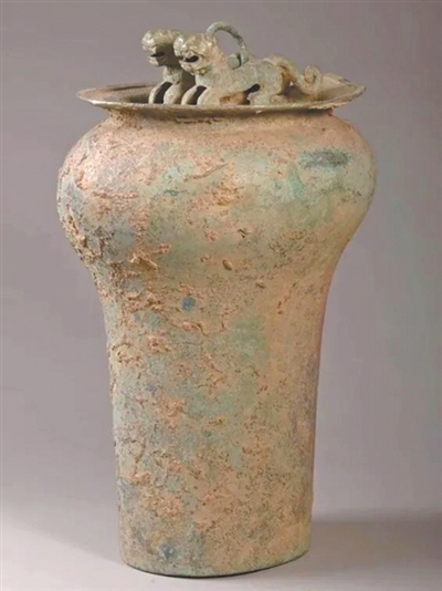 ▲湖北恩施土家族苗族自治州建始县景阳河出土的双虎钮青铜錞于